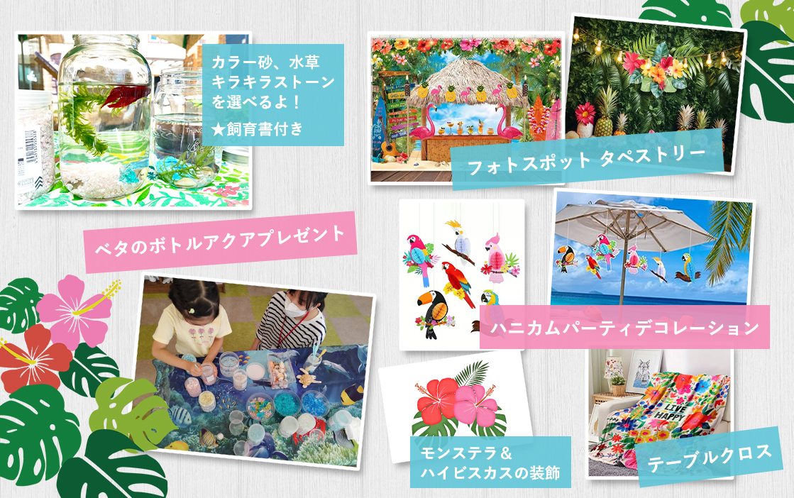 トロピカルな装飾と熱帯魚のコラボ展示!フォトスポットもあるので記念撮影会してね!